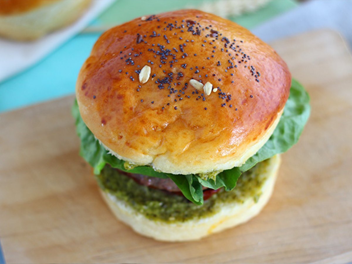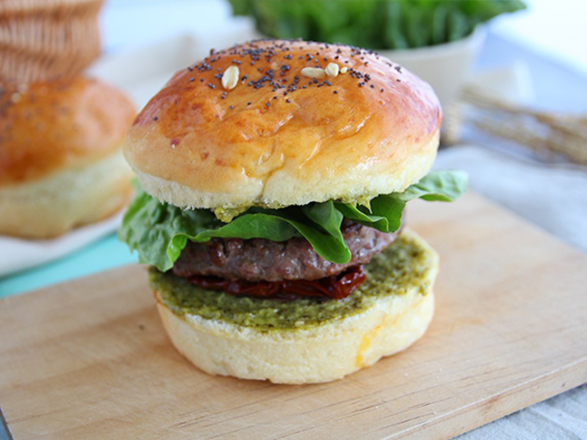 Hamburguesa italiana con pesto, tomates secos y mozzarella