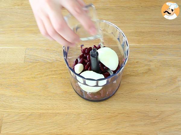 En un recipiente para triturar, poner las habas (si son de bote, escurrirlas previamente) + ajo + cebolla + un poco de agua. Triturar