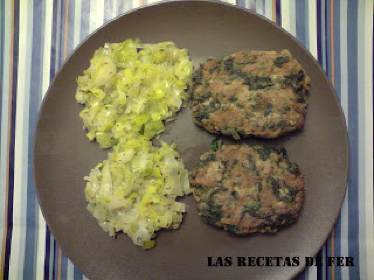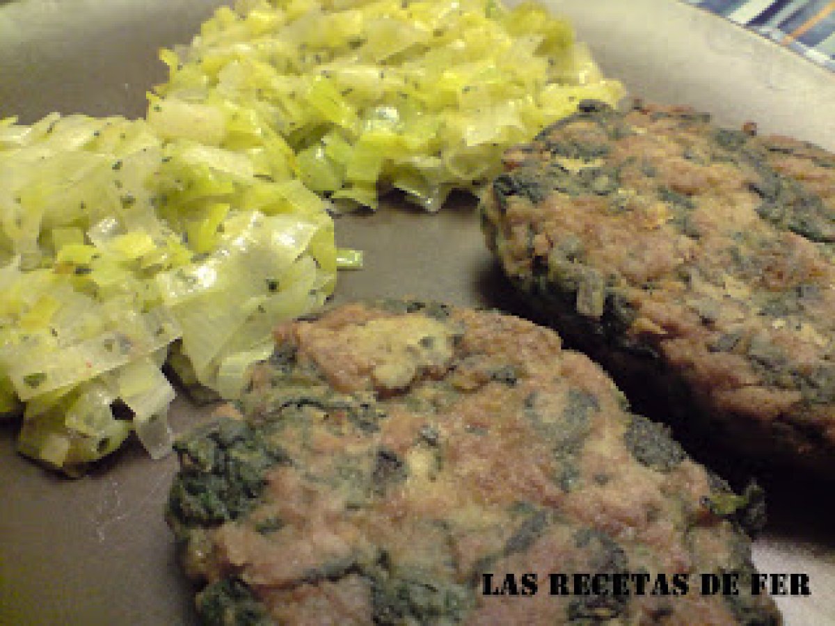 Hamburguesas de espinacas con puerro vota ahora AnteriorSiguiente PlatoFácil35 min419 Kcal Enviar esta receta a un amigo Imprimir esta página Preguntar al autor Publicar la foto de esta receta Ingredientes 2 200 g de tenera 100 g de espinacas 1 puerro 1 huevo 2 cucharadas de pan rallado 2 ajos 1 vaso de vino blanco Perejil Pimienta negra Aceite oliva extra virgen sal Costo estimado: 4.89Euros€ (2.45€/porción)