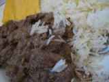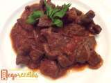 - Cuando la cebolla empiece a dorase añadimos la carne , damos unas vueltas para sellarla y seguidamente echamos el vino , dejamos que evapore el alcohol , agregamos el laurel , la pimienta , la pastilla de caldo y el agua si vemos que la necesita .
