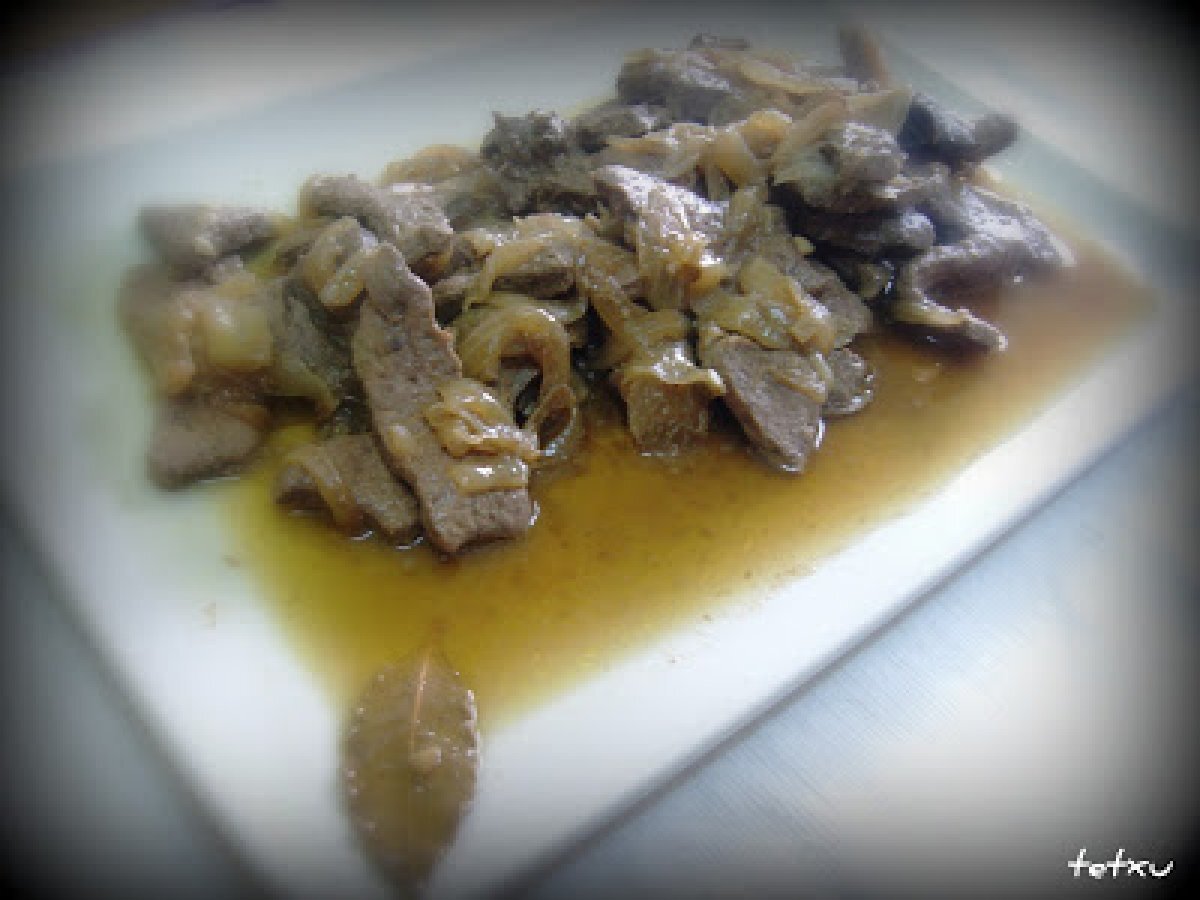 - Programar la fussion en menú manual 160º 10 minutos , añadir a la cubeta un buen chorro de aceite de oliva , 40 mililitros poco mas o menos , cuando este el aceite caliente echamos la cebolla y el ajo cortados en juliana , mientras se pochan cortamos el hígado en tiras o trozos un poquito al gusto.