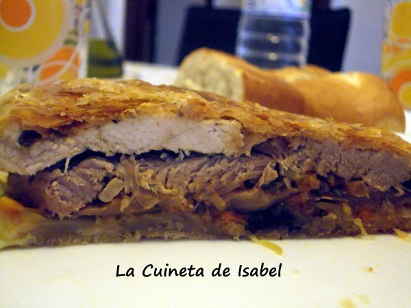 Hojaldre relleno de lomo y verduras PlatoMedio35 min Enviar esta receta a un amigo Imprimir esta página Preguntar al autor Publicar la foto de esta receta Ingredientes 3 1 Filete por paquetito de caña de lomo 1 Lamina de hojaldre bien estirada 1 Cebolla ralladita fina 1 Pimiento verde italiano cortado a tiras 1 Zanahoria cortada a tiras 4 o 5 pasas por paquetito 1 o 2 rovellones o "bolets" por paquetito 1 Cucharadita de guisantes Medio vaso de vino blanco 1 Huevo Aceite de oliva, sal y pimienta