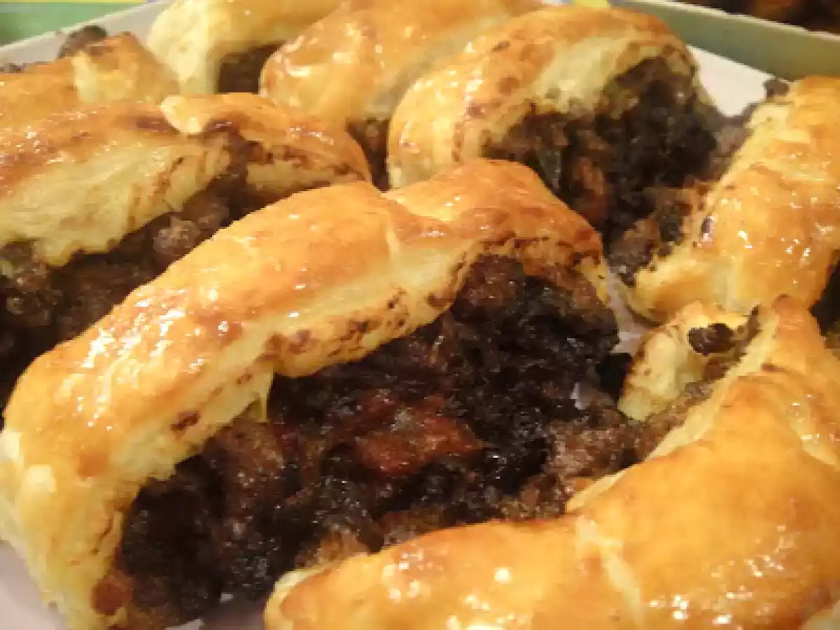 Hojaldres de carne estofada, zanahorias y ciruelas AnteriorSiguiente PlatoFácil1 hora Enviar esta receta a un amigo Imprimir esta página Preguntar al autor Publicar la foto de esta receta Ingredientes 6 1 plancha de masa de hojaldre carne picada 2 o 3 zanahorias cocidas media cebolla 1 puerro 6 ciruelas sin hueso 1 cdta de curry 1 cdta de canela 2 cdas de vinagre balsámico de módena sal y pimienta 1 huevo