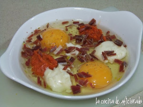 Huevos al plato con sobrasada y torta del casar AnteriorSiguiente PlatoFácil20 min Enviar esta receta a un amigo Imprimir esta página Preguntar al autor Publicar la foto de esta receta Ingredientes 1 1 o 2 huevos por persona. 2 cucharaditas de sobrasada por persona. 3 cucharaditas de Torta del Casar por persona. Jamón o paleta ibérica. Sal. Pimienta.