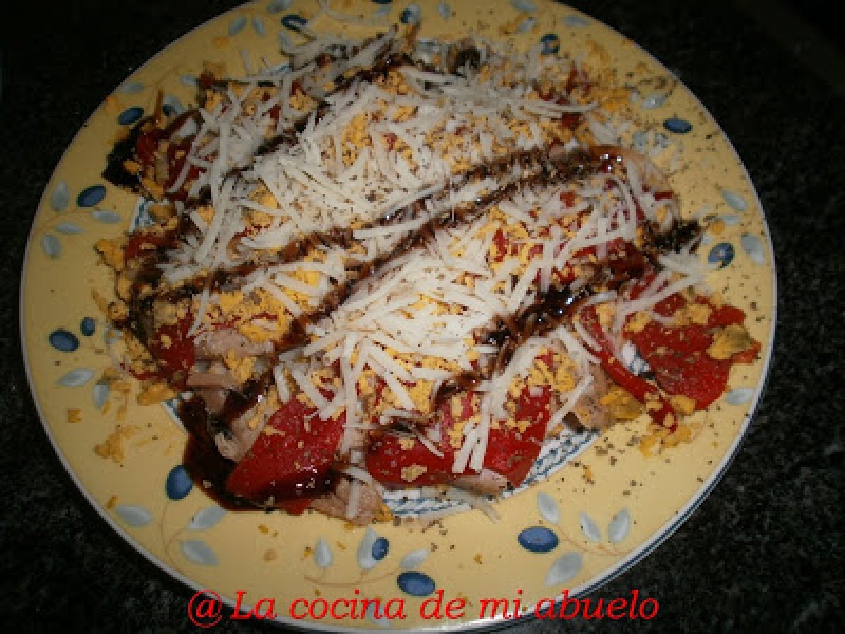 Huevos asados PlatoFácil35 min Enviar esta receta a un amigo Imprimir esta página Preguntar al autor Publicar la foto de esta receta Ingredientes 2 Dos claras de huevo asado, la reserva de yema Tiras de piquillo asado Queso Unas gotas de vinagre balsámico