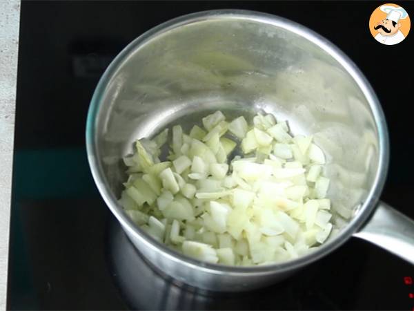 Calienta el aceite en una cacerola grande. Pocha la cebolla picada.