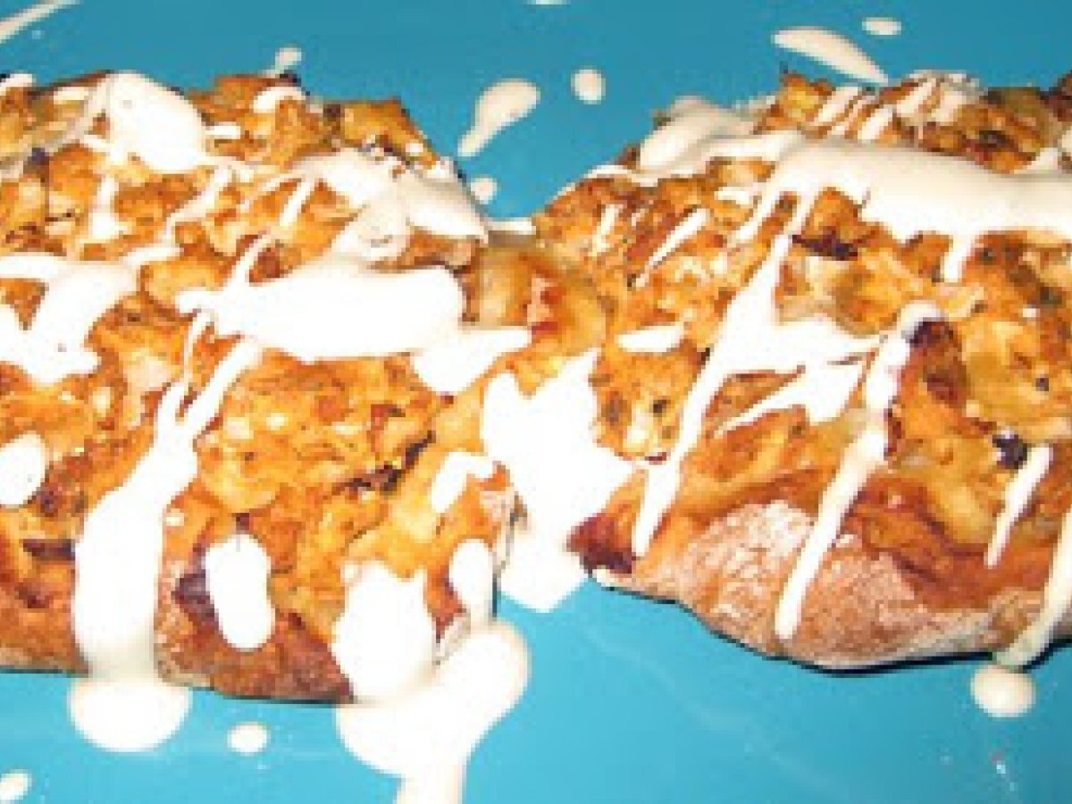 - Calentar el horno a 200 grados. Con un palo de amasar aplanar cada bolita hasta obtener un espesor de medio centímetro, colocar una cucharada grande del relleno y adornar con los piñones.