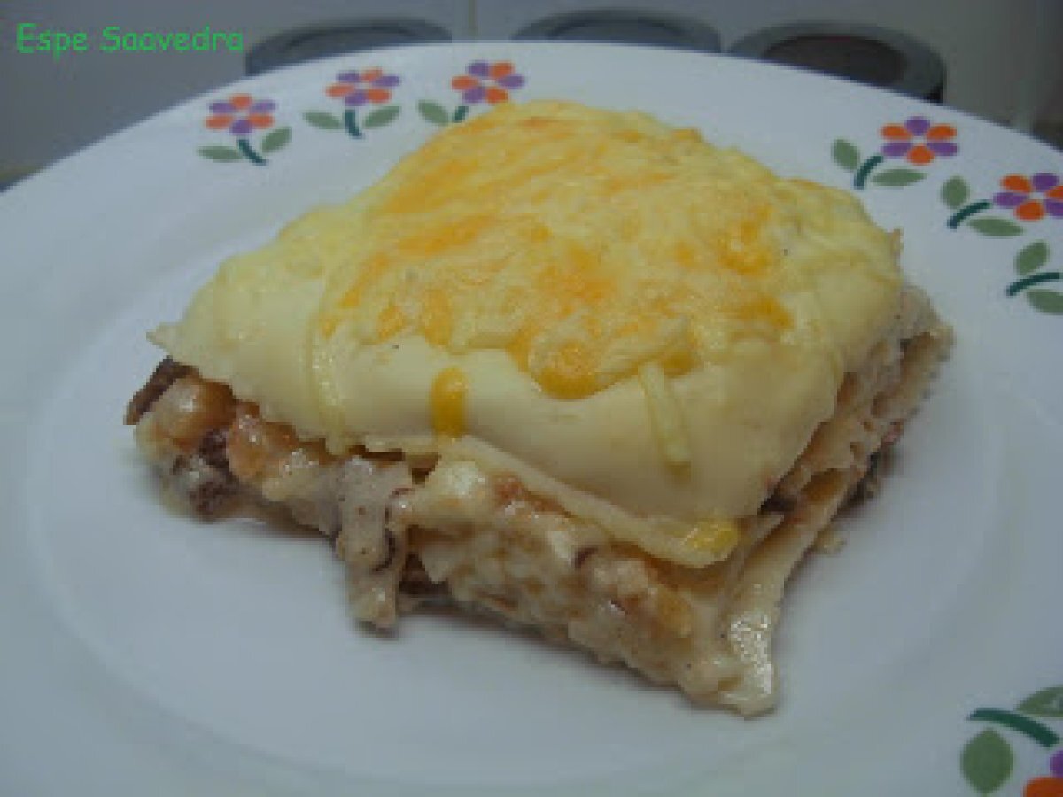 Lasaña de boletus y gambas PlatoFácil45 min Enviar esta receta a un amigo Imprimir esta página Preguntar al autor Publicar la foto de esta receta Ingredientes 2 12 placas de lasaña, 200g de gambas congeladas, 300 g de boletus, 1 cebolla pequeña, 120 ml de nata para cocinar, sal y pimienta negra molida, 1/2 litro de bechamel clarita.