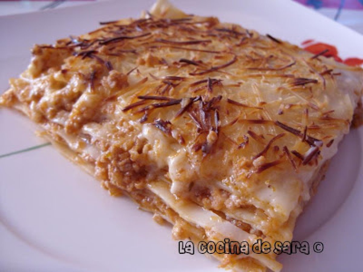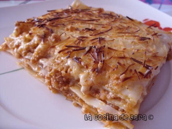 Lasaña de carne (thermomix) PlatoMedio50 min1894 Kcal Enviar esta receta a un amigo Imprimir esta página Preguntar al autor Publicar la foto de esta receta Ingredientes 4 16 placas de lasaña precocidas 50 g aceite de oliva 1 cebolla 1 diente de ajo 1 bote pequeño de tomate natural triturado 500 g carne picada sal pimienta orégano 1 hoja de laurel bechamel queso para gratinar