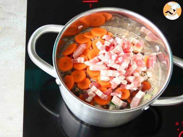 Pela la zanahoria y corta en rodajas. Añade a la cacerola + bacon. Mezclar.