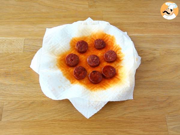 Coloca los trozos de chorizo en un plato con servilletas (papel absorbente). Meter 1 min al microondas. De esta manera, soltarán la grasa antes de añadirlo y las lentejas serán más saludables.