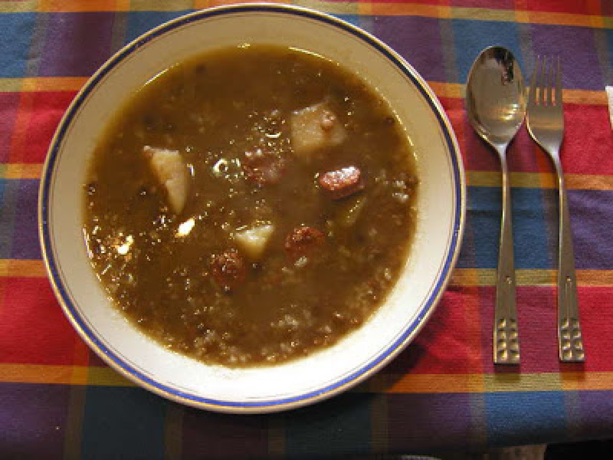 Lentejas con chorizo arroz y patata PlatoFácil50 min601 Kcal Enviar esta receta a un amigo Imprimir esta página Preguntar al autor Publicar la foto de esta receta Ingredientes 4 250 g de lentejas 100 g de arroz 4 patatas 1 chorizo 1 cebolla 1 diente de ajo sal y aceite. agua. Costo estimado: 3.72Euros€ (0.93€/porción)