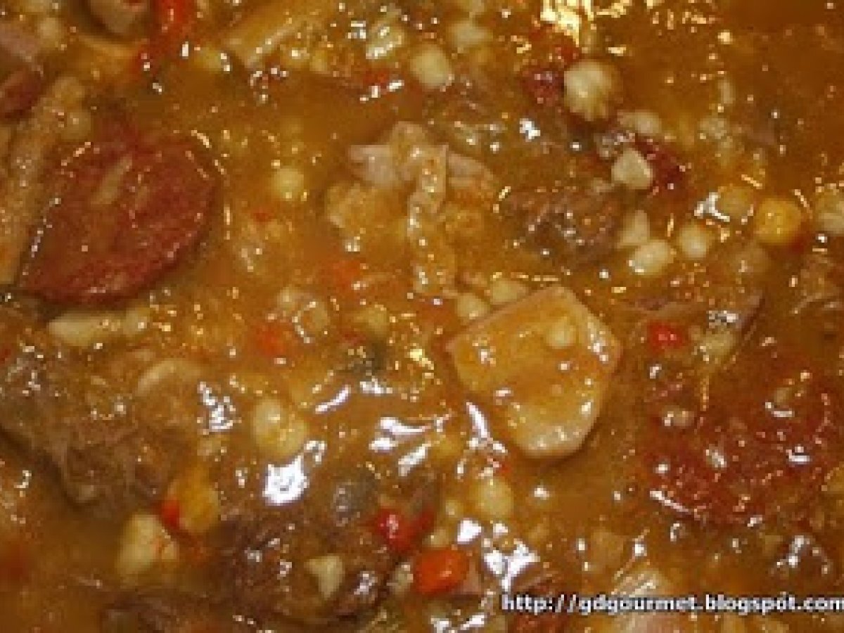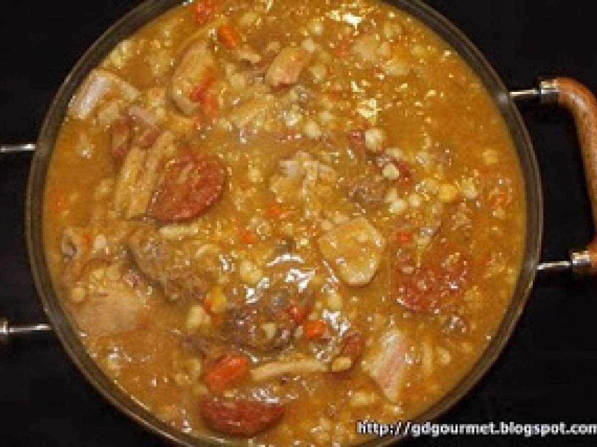 - La noche anterior, colocar en remojo, separados, los porotos y el maíz, este último en abundante agua.Al día siguiente, poner a hervir el mondongo durante 1 hora, aproximadamente, en agua con sal.Retirar del fuego y cortar en pequeñas tiras.Cortar los chorizos en rodajas y la panceta en tiras.El pechito y la carne vacuna en trozos medianos.La patita de cerdo, pedir al carnicero que la corte en 4.