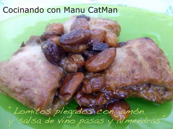 Lomitos plegados con jamón y salsa de vino, pasas y almendras vota ahora PlatoFácil35 min Enviar esta receta a un amigo Imprimir esta página Preguntar al autor Publicar la foto de esta receta Ingredientes 2 Filetes de cinta de lomo 30-50 gr de uvas pasas 30-50 gr de Almendras crudas Vino blanco Vino dulce Jamón serrano en lonchas finas Sal y pimienta Harina para rebozar 200 ml de caldo de carne