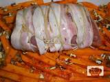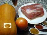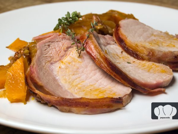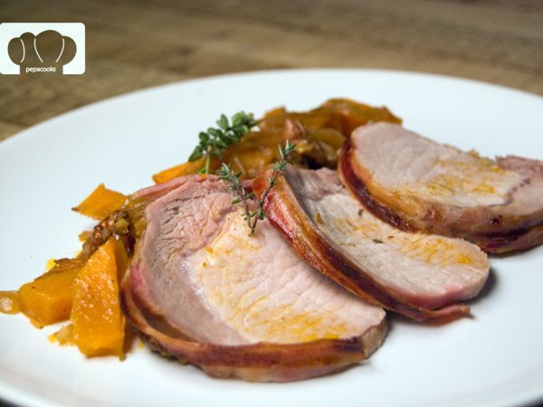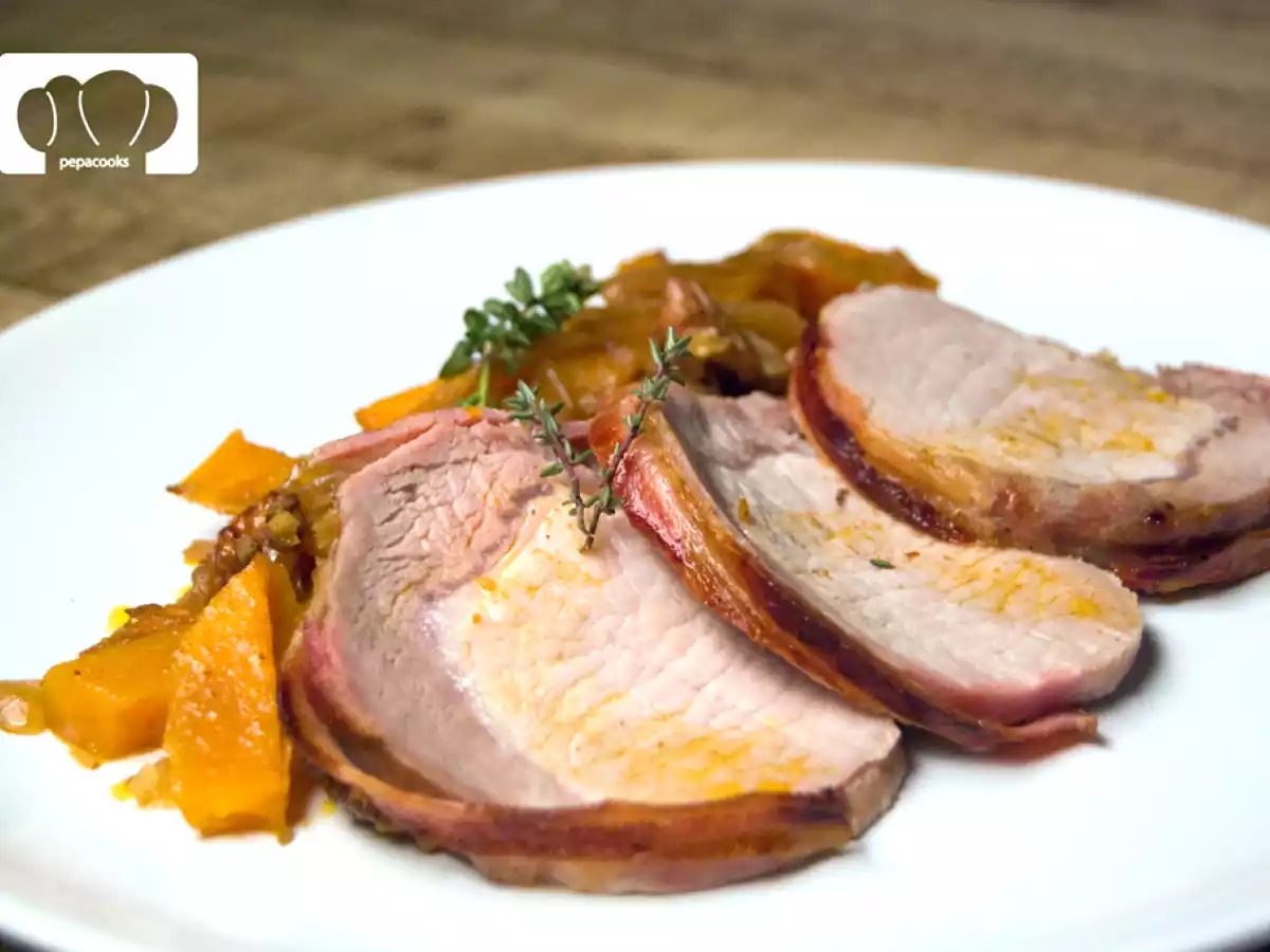 Lomo al horno con calabaza AnteriorSiguiente PlatoFácil55 min832 Kcal Enviar esta receta a un amigo Imprimir esta página Preguntar al autor Publicar la foto de esta receta Lomo al horno con calabaza Ingredientes 4 Un kilo de lomo de cerdo Una cebolla 400 g de calabaza Media copita de vinagre de jerez Una cucharada de curry Una cucharada de pimentón Una cucharada de comino Aceite de Oliva Virgen Extra sal y pimienta tiras de bacon Costo estimado: 11.79Euros€ (2.95€/porción)
