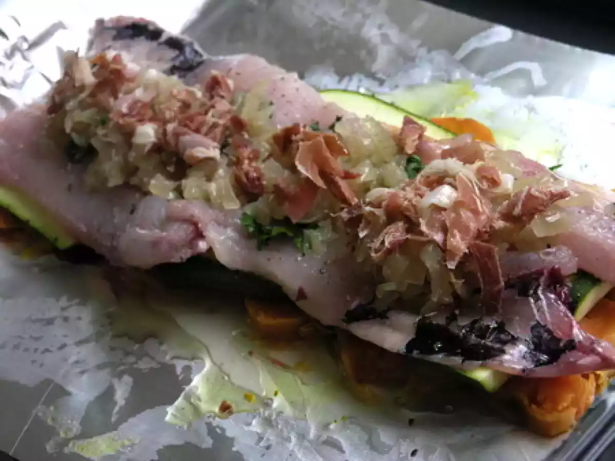 Lomo de brótola al horno con verduras en papillote AnteriorSiguiente PlatoFácil35 min Enviar esta receta a un amigo Imprimir esta página Preguntar al autor Publicar la foto de esta receta Ingredientes 1 1 lomo de brótola de 250 g 1 boniato hervido con piel 1 calabacín mermelada de cebolla jamón serrano picado fino cúrcuma en polvo pimienta