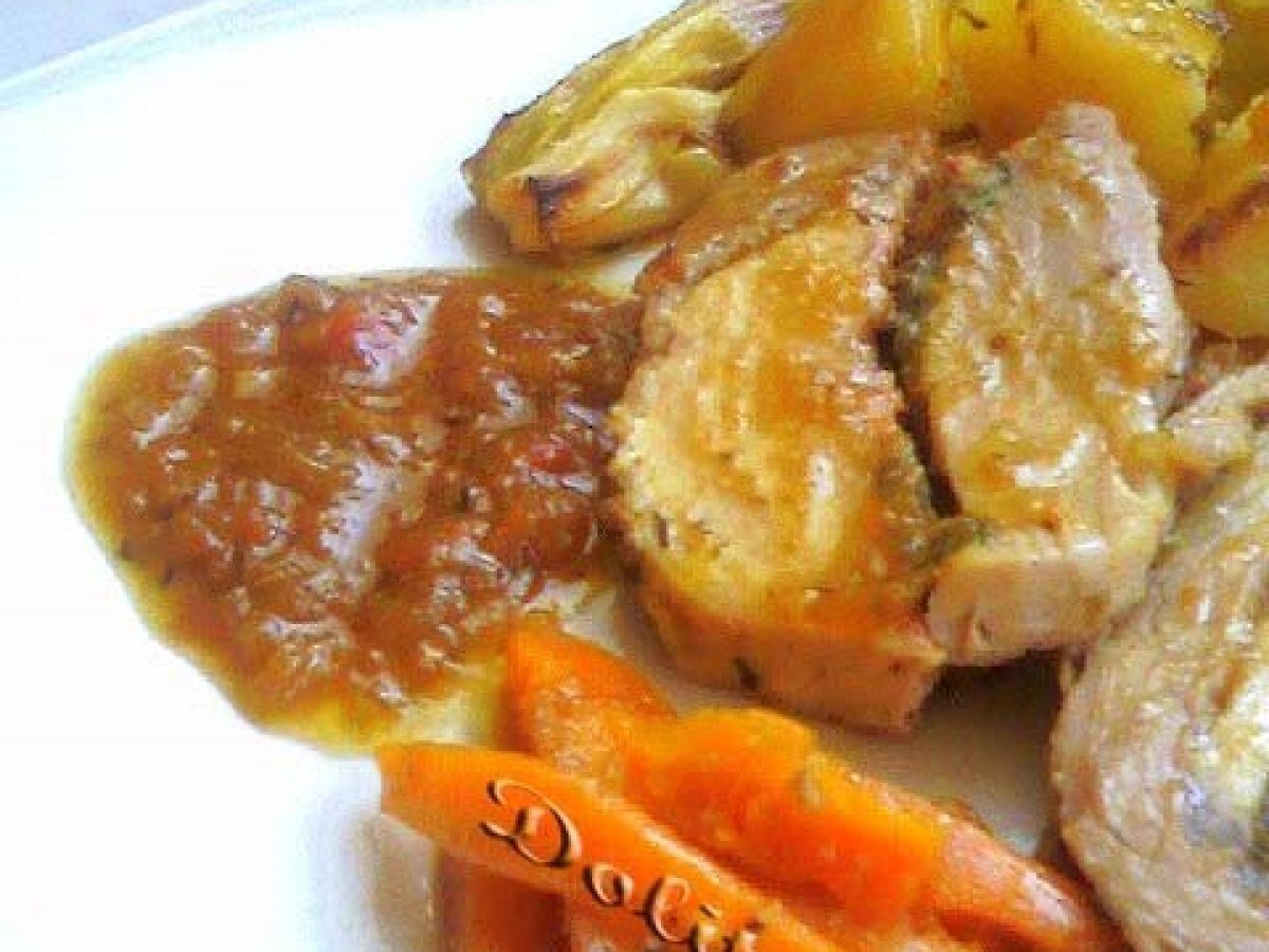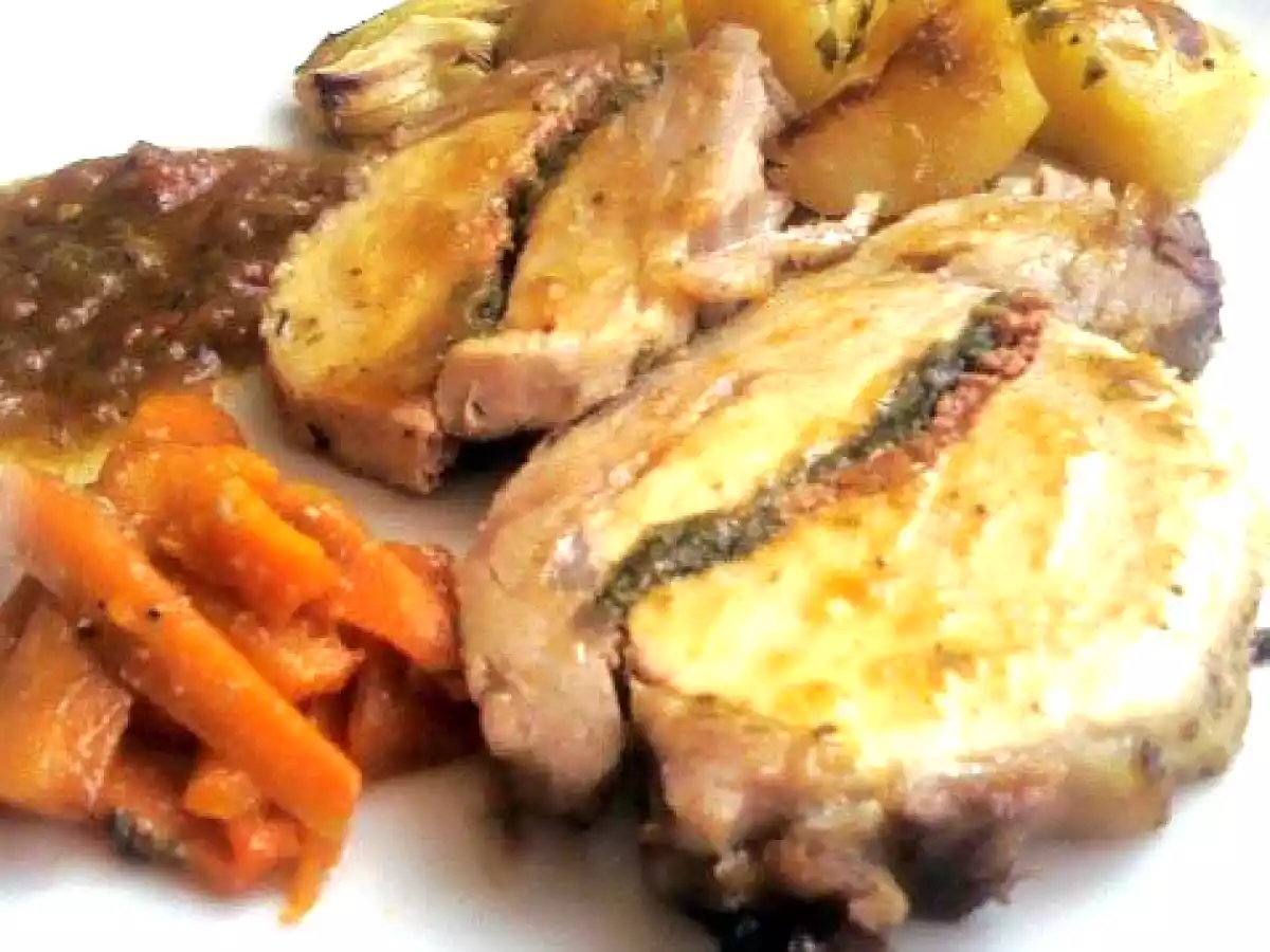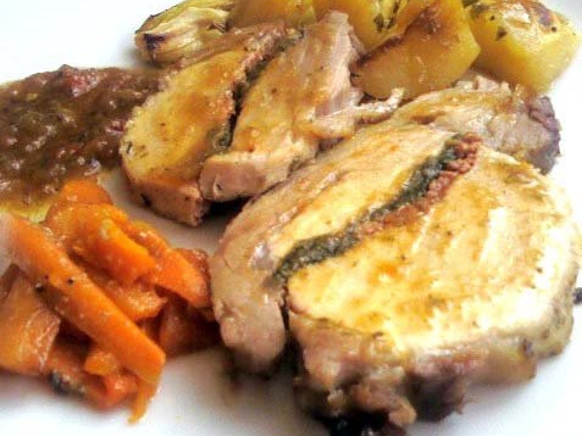 Lomo de cerdo al horno relleno de pate y espinacas AnteriorSiguiente PlatoFácil1 h 30 m431 Kcal Enviar esta receta a un amigo Imprimir esta página Preguntar al autor Publicar la foto de esta receta Esta es una receta muy sabrosa para el almuerzo. Ingredientes 2 Un lomo de cerdo Ajo Jerez Tomillo Una cebolleta Zumo de limón Sal y pimienta 2 puerros Zanahorias Patatas Espinacas Paté a las finas hierbas Aceite de oliva Una cerveza Costo estimado: 3.87Euros€ (1.93€/porción)