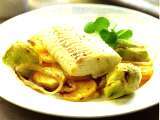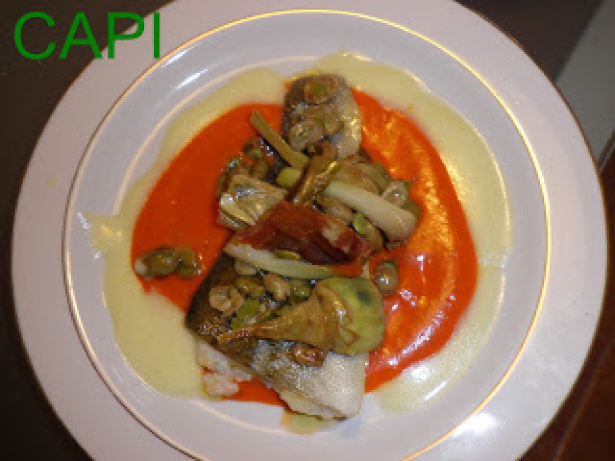 Lomos de bacalao sobre salsa de piquillos con verduras y espima de pil-pil
