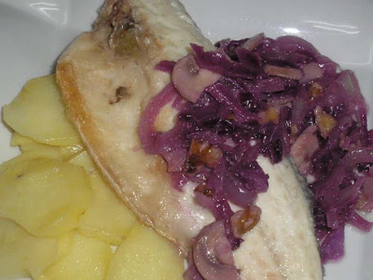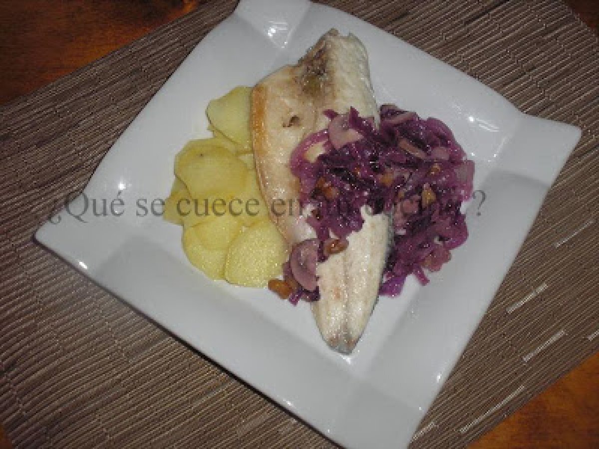 Lomos de lubina con cama de lombarda caramelizada , champis y nueces AnteriorSiguiente PlatoFácil30 min Enviar esta receta a un amigo Imprimir esta página Preguntar al autor Publicar la foto de esta receta Esta es una muy deliciosa receta. Ingredientes 2 Dos lubinas, que nos las limpien y nos dejen los lomos unas patatas panadera para acompañar, yo las hago en bolsa de asar y en el microondas. un pedazo de col lombarda una cebolla tierna unos champiñones una cucharada colmada de azúcar un puñado de nueces sal, pimienta aceite y vinagre.