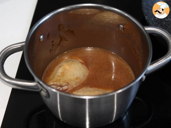 Añadir la salsa barbacoa a los trozos de pollo y cubrir con agua. Cocer durante 30 / 35 minutos a fuego medio. Remover de vez en cuando.