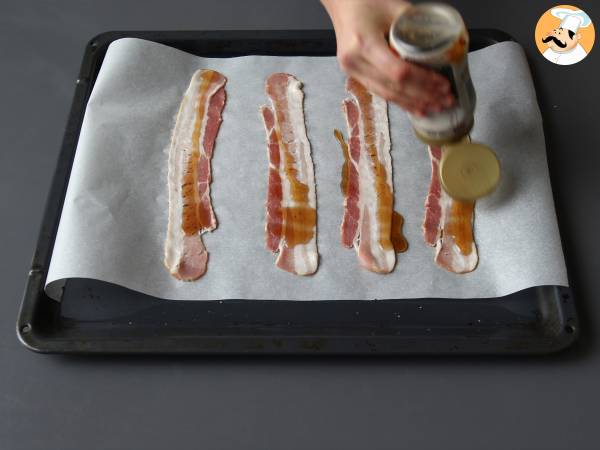 Disponer el bacon en una bandeja de horno con papel sulfurizado y untar cada loncha con sirope de arce.