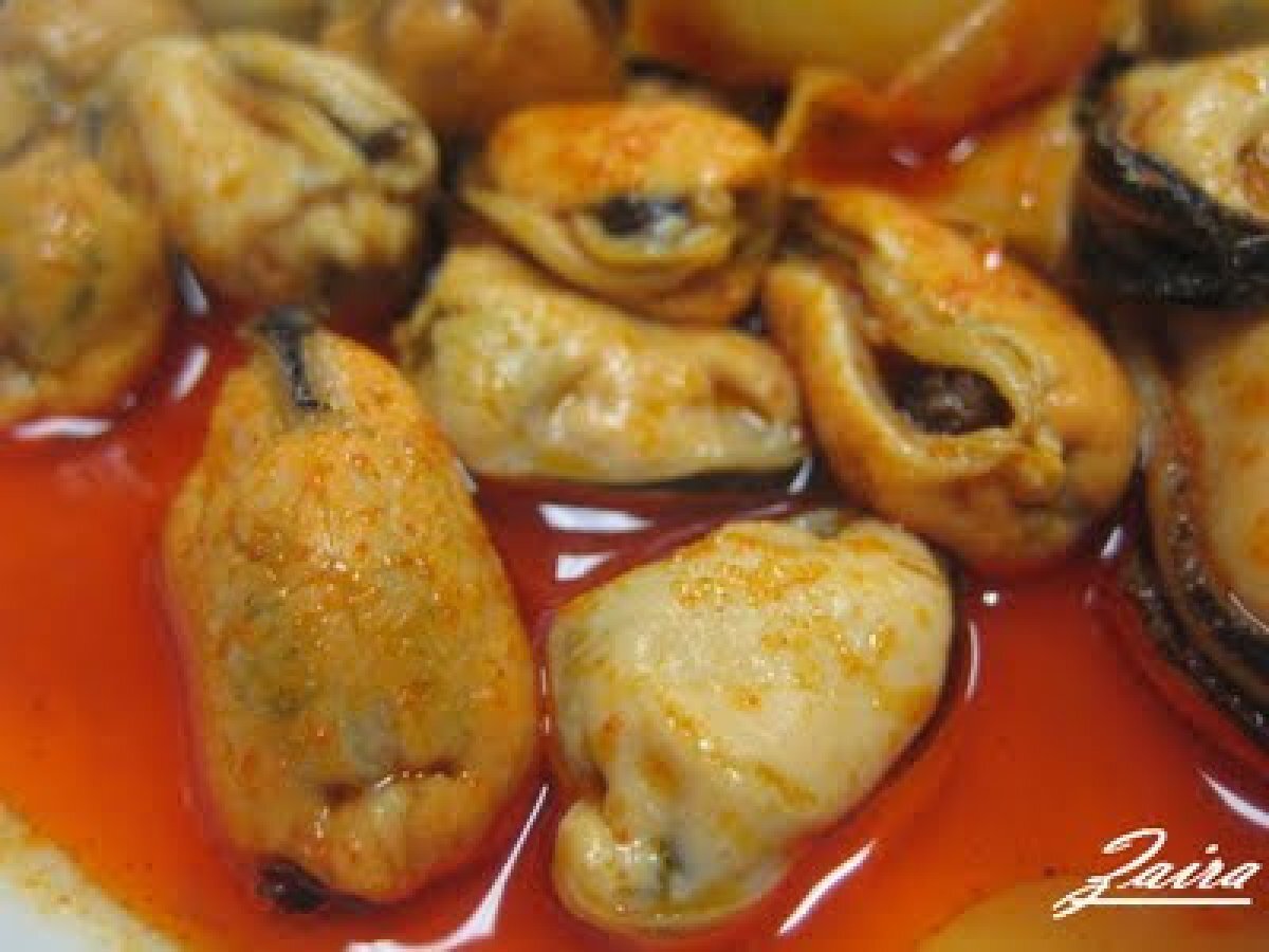 Mejillones en escabeche de pimentón vota ahora AnteriorSiguiente PlatoFácil50 min1138 Kcal Enviar esta receta a un amigo Imprimir esta página Preguntar al autor Publicar la foto de esta receta Ingredientes 2 3 kilos de mejillones 3 dl. de aceite de oliva 1 dl. de vinagre de jerez 2 dl. de jugo de los mejillones 1 cucharadita de pimienta negra 1 cucharada sopera de pimentón dulce de La Vera 6 dientes de ajo 3 hojas de laurel un poco de sal un pellizco de azúcar Costo estimado: 18.38Euros€ (9.19€/porción)