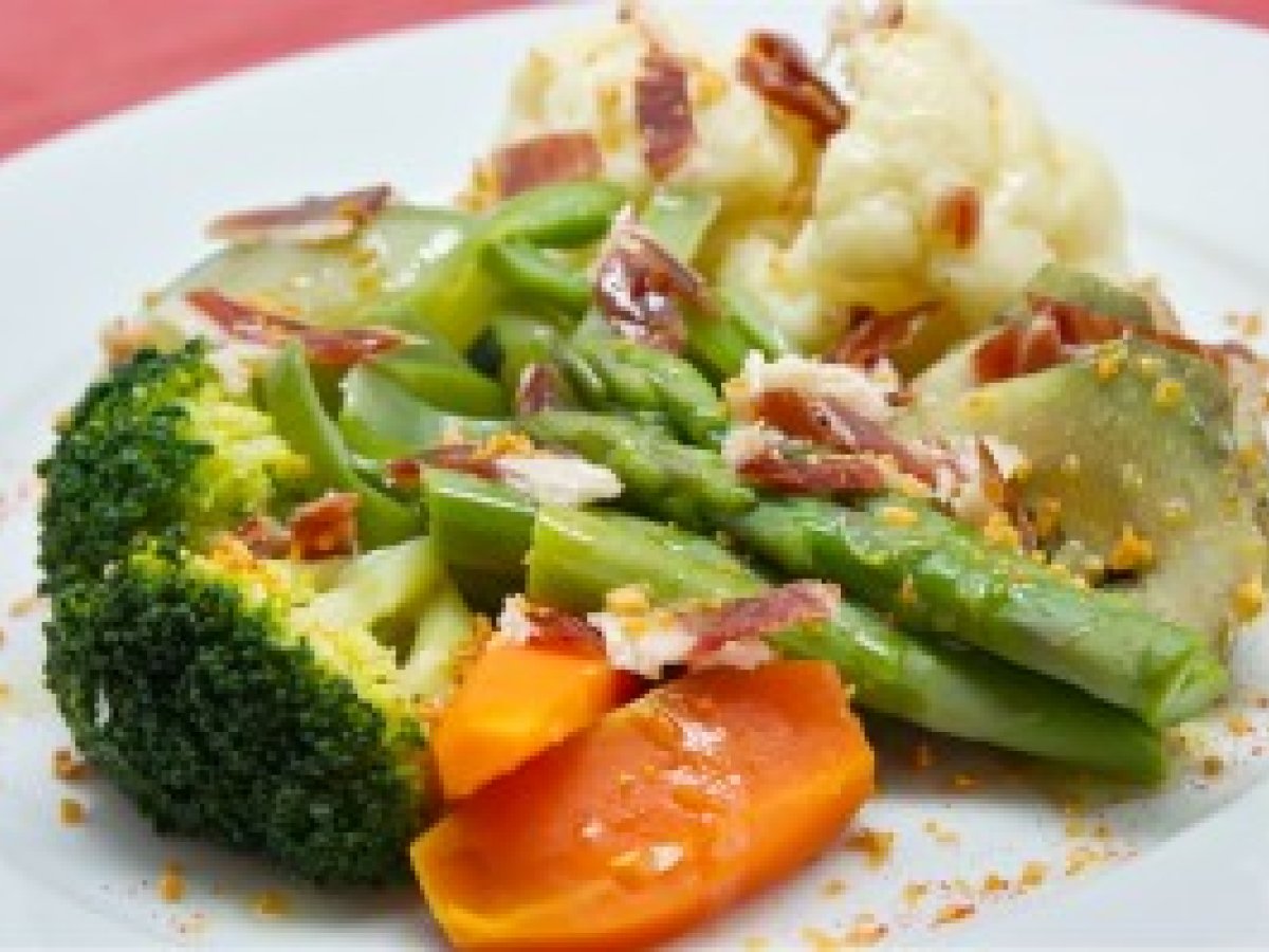 Menestra de verduras con jamón ibérico y crujiente de ajo. Esta es una receta muy deliciosa.