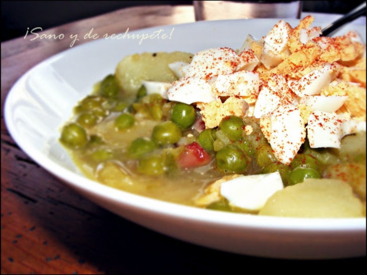 Menestra ligera de guisantes vota ahora AnteriorSiguiente PlatoMedio1 h 5 m Enviar esta receta a un amigo Imprimir esta página Preguntar al autor Publicar la foto de esta receta Ingredientes 2 300 g de guisantes congelados 2 papas medianas peladas, lavadas y cortadas a cascos 1 pimiento verde mediano picado 1 cebolla mediana picada 3 dientes de ajo majados 125 g de bacon 1/2 l de caldo de verduras 2 huevos duros picaditos aceite de oliva virgen extra, sal gruesa, pimienta negra recién molida, una hoja de laurel, comino en polvo, pimentón agridulce