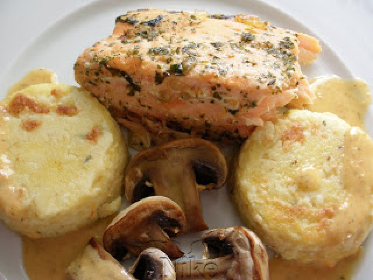 Menú de domingo con glamour: salmón al horno y pastelillos de patata y tomillo AnteriorSiguiente PlatoFácil55 min Enviar esta receta a un amigo Imprimir esta página Preguntar al autor Publicar la foto de esta receta ¡ Muy rico de ingredientes, voluminosos con arroz blanco! Ingredientes 5 1 lomo de salmón sin piel zumo de limón, sal, pimienta 2 Cucharadas de hierbas picadas 2 Cucharadas de aceite de oliva 1 cebolla 1 ajo 2 perejil 1 tomate 1/8 de vino blanco aceite de oliva sal 3 Cucharadas de crème fraîche cayena al gusto 400 g de patatas harinosas (para cocer) sal 100 g de almendras molidas 1 huevo (M) 50 g pan rallado 150 g de Creme fraîche 1 Cucharada de tomillo fresco