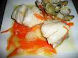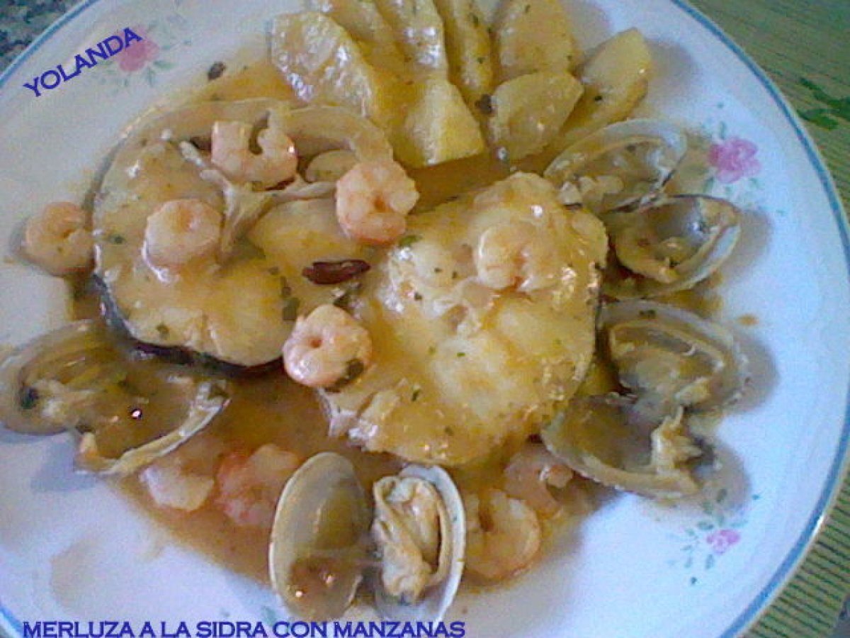 Merluza a la sidra con manzanas PlatoMedio1 hora Enviar esta receta a un amigo Imprimir esta página Preguntar al autor Publicar la foto de esta receta Ingredientes 4 4 rodajas de merluza hermosas,200grms de gambas,200grms de almejas,1cebolla,2 dientes de ajo,perejil fresco picado, harina de maiz, (maizena) 2 vasos de sidra seca,fumet ( de cocer las cáscaras de las gambas que hay que pelar y la cabeza de la merluza),1 puerro,1zanahoria,aceite de oliva virgen ,salsa de tomate,1 guindilla ,1 manzana golden y sal.
