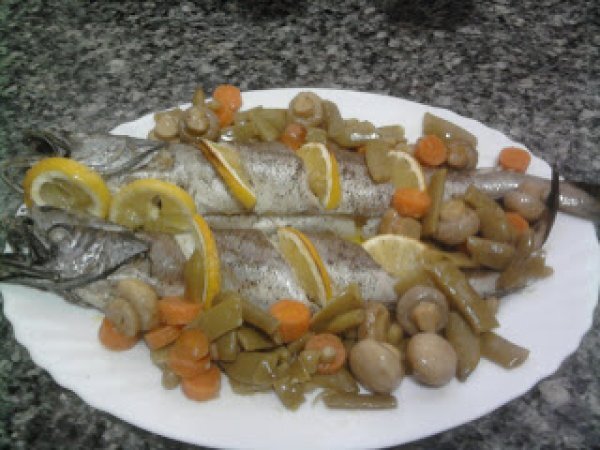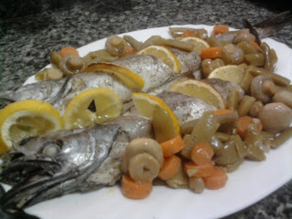 Merluza al horno con verdura AnteriorSiguiente PlatoFácil35 min331 Kcal Enviar esta receta a un amigo Imprimir esta página Preguntar al autor Publicar la foto de esta receta Ingredientes 2 Dos merluzas Unas judías verdes Unos guisantes Unos champiñones Un par de zanahorias Unas rodajas de limón Pimienta Sal Aceite Vino Costo estimado: 5.43Euros€ (2.71€/porción)