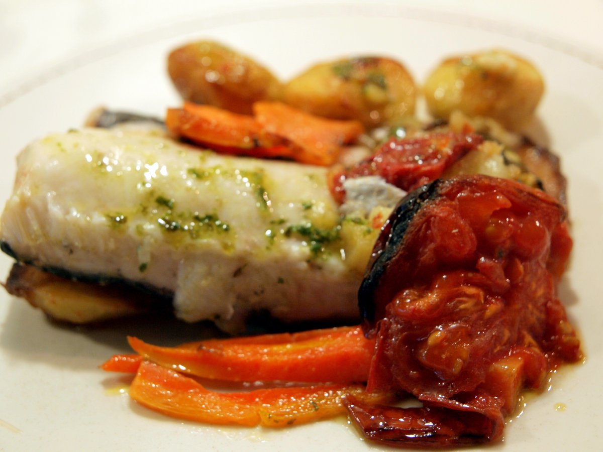 Merluza al horno con verduras AnteriorSiguiente PlatoMedio55 min Enviar esta receta a un amigo Imprimir esta página Preguntar al autor Publicar la foto de esta receta Ingredientes 2 Ingredientes para 4 personas Una merluza de 1500 gramos aproximadamente 1 boniato medio kilo de patatas minis 1 cebolla 3 tomates maduros 2 zanahorias 1 calabacin