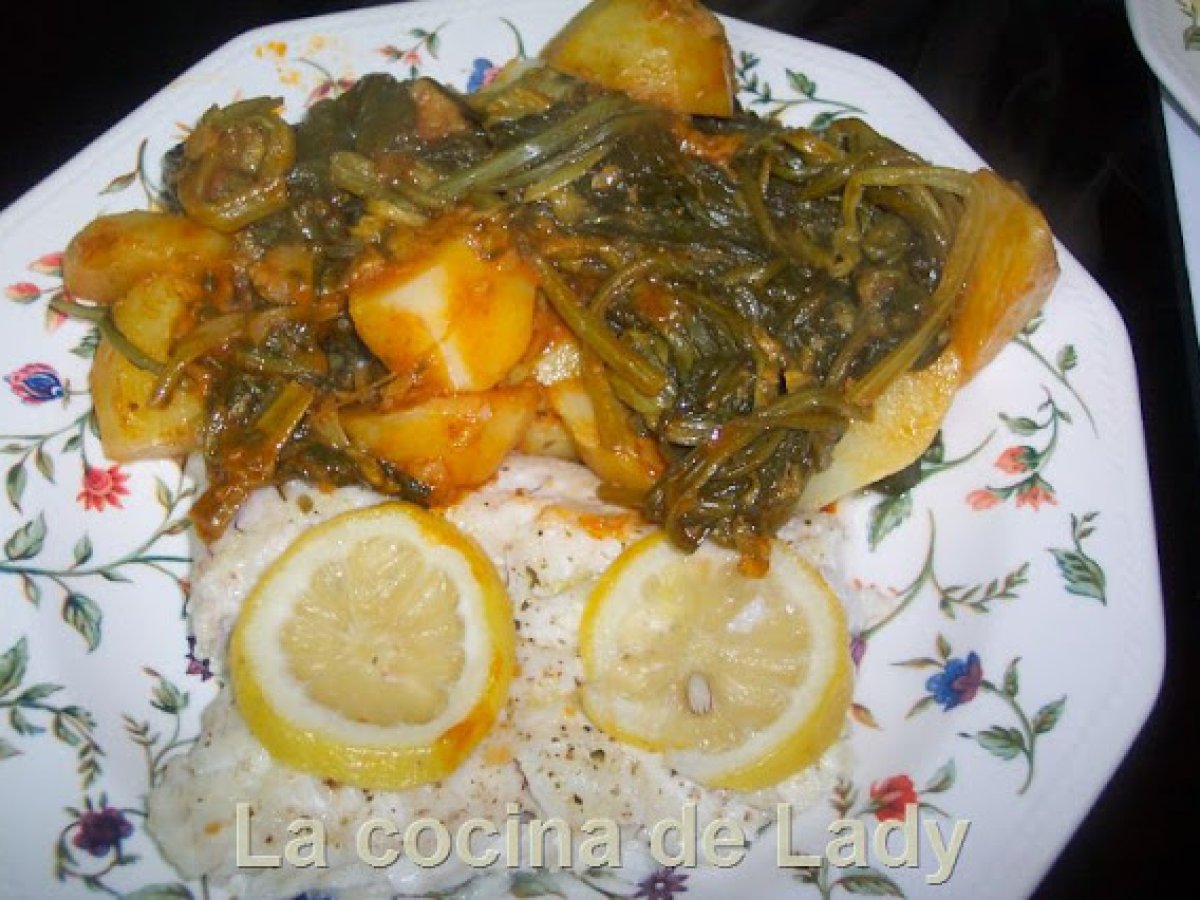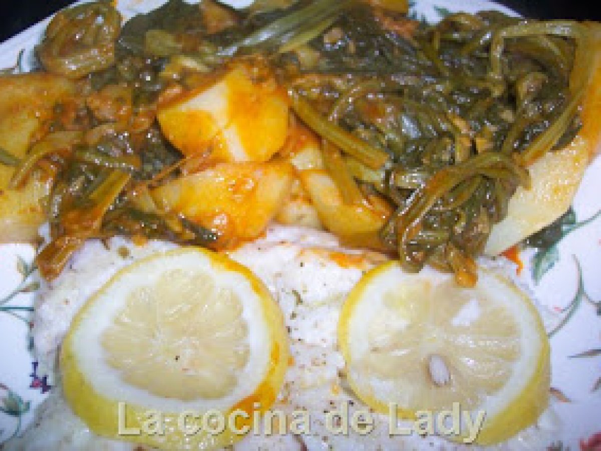 Merluza al varoma y acelgas con patatas vota ahora AnteriorSiguiente PlatoFácil1 h 5 m518 Kcal Enviar esta receta a un amigo Imprimir esta página Preguntar al autor Publicar la foto de esta receta Ingredientes 2 500 g de Acelgas 2 Patatas medianas en trozos 4 Dientes de Ajo 40 g de Aceite de Oliva Sal 1 Cucharadita de Pimentón 750 g de Agua 1 Cola de Merluza o cualquier pescado sin espina que os guste Aceite de Oliva Pimienta Molida 1/2 Limón a Rodajas Sal Costo estimado: 5.05Euros€ (2.53€/porción)
