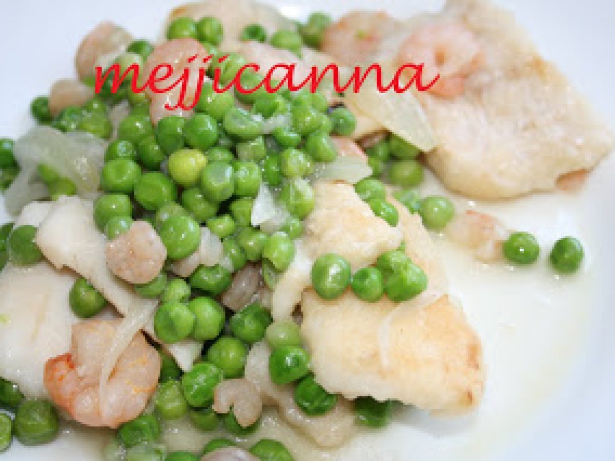Merluza con guisantes y gambas PlatoFácil30 min810 Kcal Enviar esta receta a un amigo Imprimir esta página Preguntar al autor Publicar la foto de esta receta Ingredientes 1 lomos de merluza . Una taza de caldo de pescado . 1 taza de guisantes . 1 tasa de gamba congelada. 1 cebolla . 1 diente de ajo . aceite de oliva . perejil picado. azafrán. harina c/n