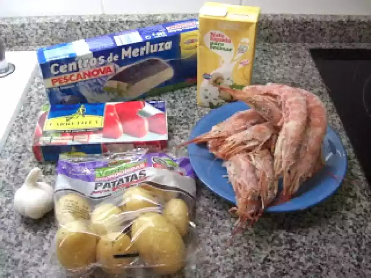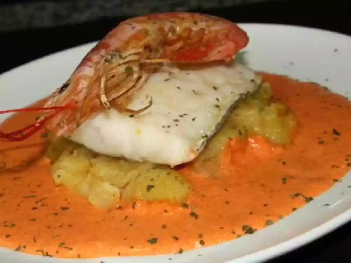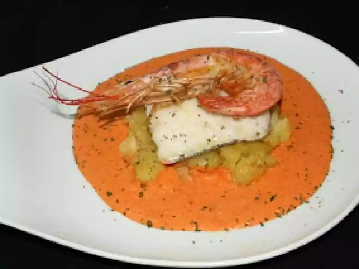 Merluza con salsa de pimientos de piquillo AnteriorSiguiente PlatoFácil39 min Enviar esta receta a un amigo Imprimir esta página Preguntar al autor Publicar la foto de esta receta Ingredientes 6 6 trozos de merluza. 12 gambas. 250 g de pimientos de Piquillo de lata. 400 g de patatas. 250 ml. de nata líquida para cocinar. Ajo, perejil, aceite y sal.