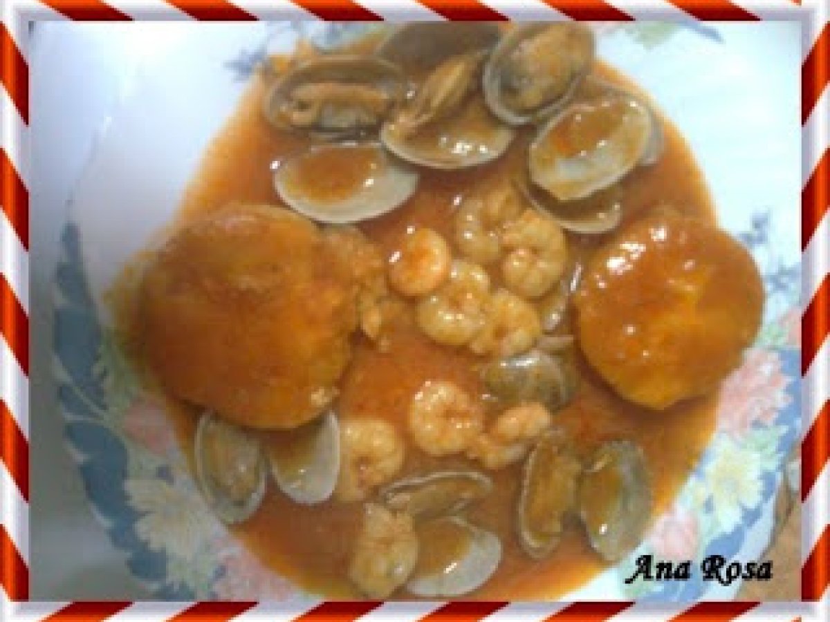 Merluza con salsa de tomate, almejas y gambas PlatoFácil30 min115 Kcal Enviar esta receta a un amigo Imprimir esta página Preguntar al autor Publicar la foto de esta receta Ingredientes 2 filetes de merluza sin piel gambas peladas almejas tomate entero de bote cebolla vino blanco perejil picado y ajo granulado