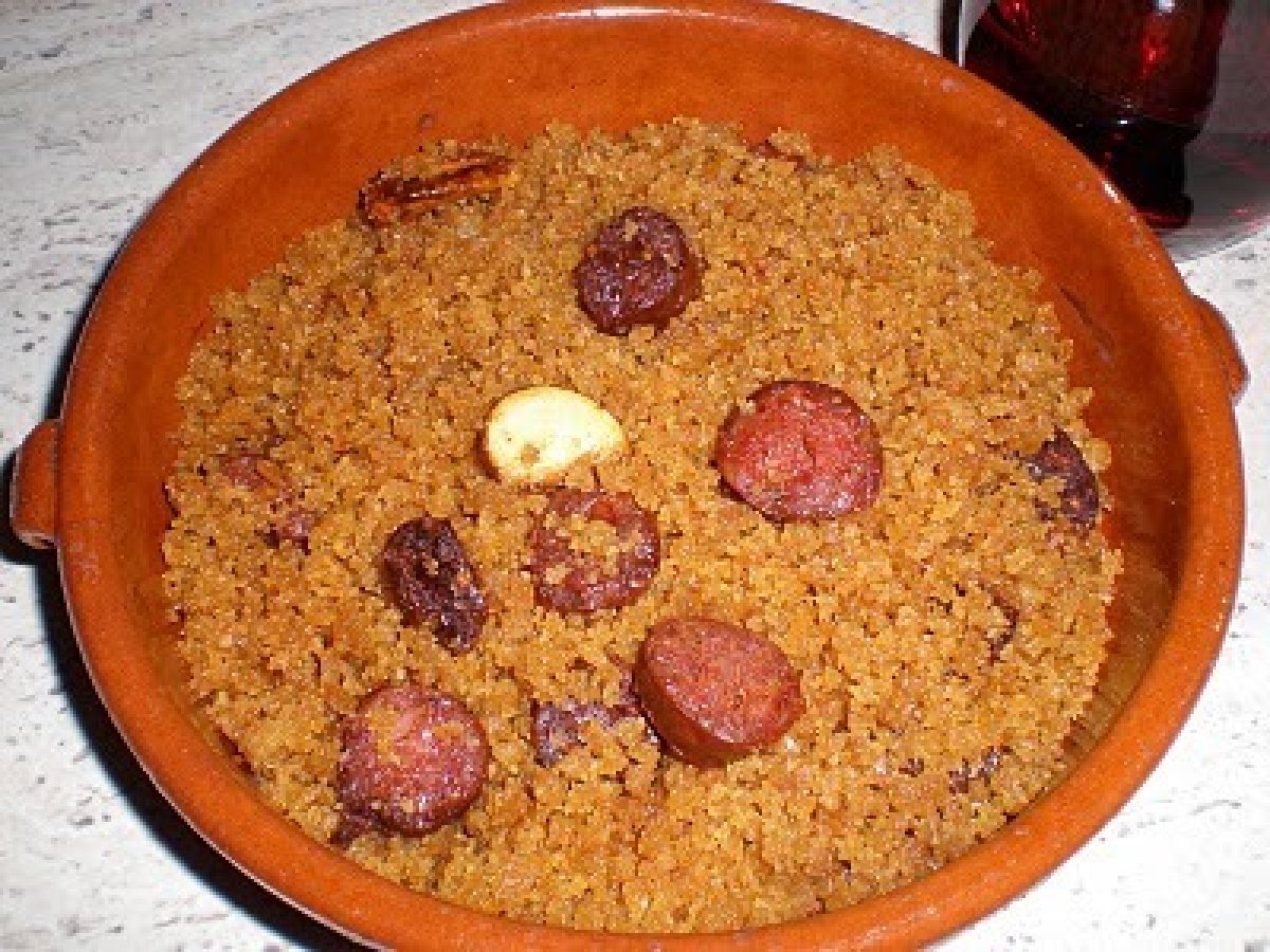Esto hará que el aceite tome color y sabor. Cuando el chorizo está churracaíto se aparta en un plato. - En este aceite se echa el pan duro y se empieza a trabajar dando vueltas y vueltas hasta que el pan pierde toda su agua. Hay que utilizar una paleta para ir separando el pan y que vaya quedando una textura de "migas".
