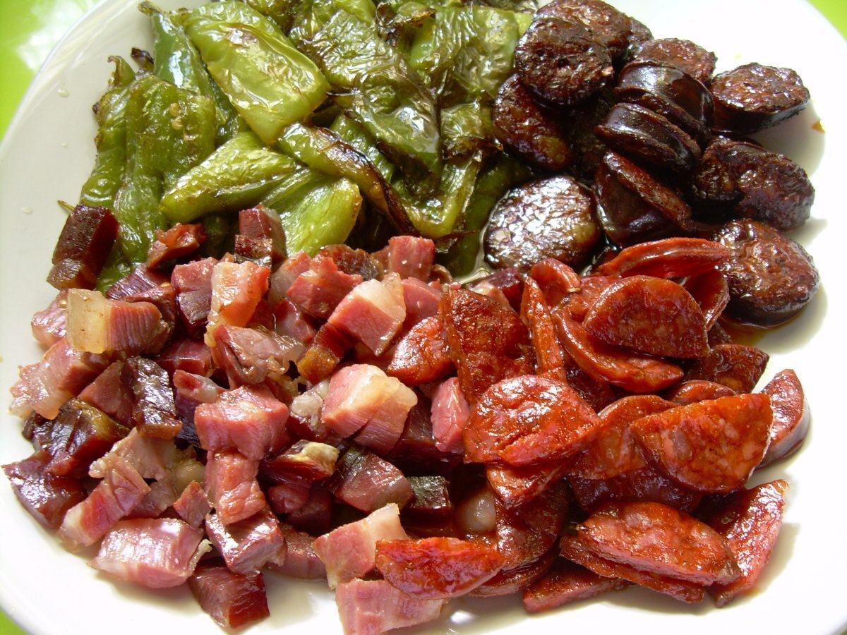 - Ponemos en la sartén aceite de oliva y freímos los pimientos a tiras, los sacamos, y en el mismo aceite freímos el jamón, lo sacamos y añadimos el chorizo, lo sacamos y añadimos el jamón, lo sacamos y en el mismo aceite echamos loas ajos fileteados, el pan anteriormente lo hemos remojado en agua y escurrido, lo echamos al aceite con lo ajos y sin parar de remover, el pan se hará una masa, pero seguimos removiendo , el pan se irá tostando y haciendo pequeñas las migas, cuando el pan esté totalmente desmigado y en cachitos muy pequeños, añadir el pimiento ya frito, la morcilla, el chorizo y el jamón, remover todo y listo para servir, podemos servirlo con unos rabanillos frescos y unas anchoas o aceitunas partidas y aliñadas,