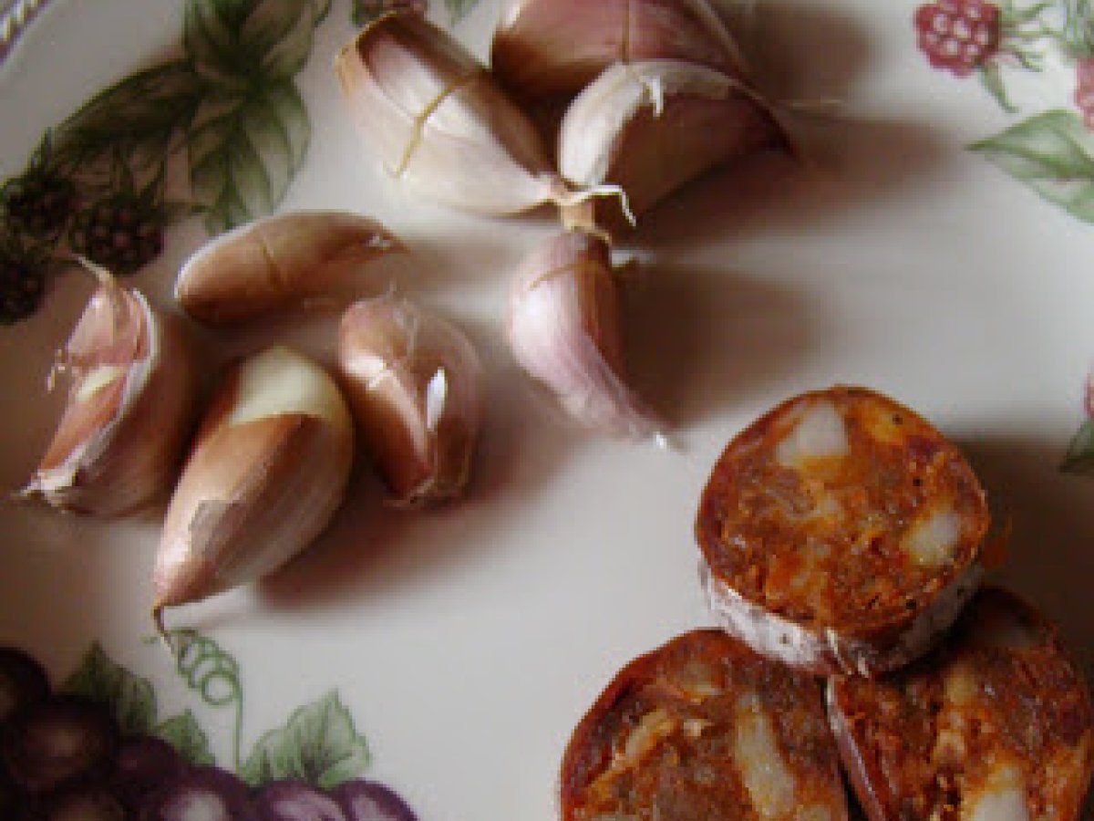 - Con una buena rasera, vamos moviendo hasta que estén doraditas. Si te gustan con chorizo y panceta se pueden poner junto a los ajos al principio o freír la panceta y el chorizo en una sartén distinta y se ponen en la mesa en un platito y que cada comensal lo coma como quiera.