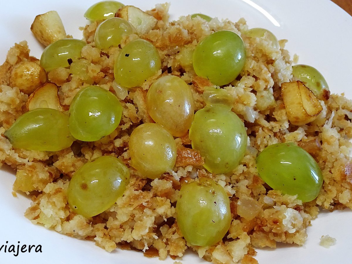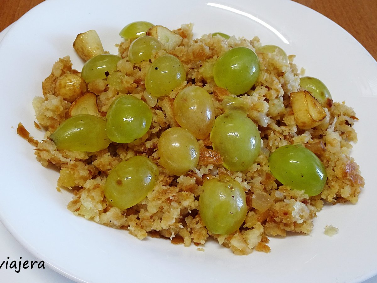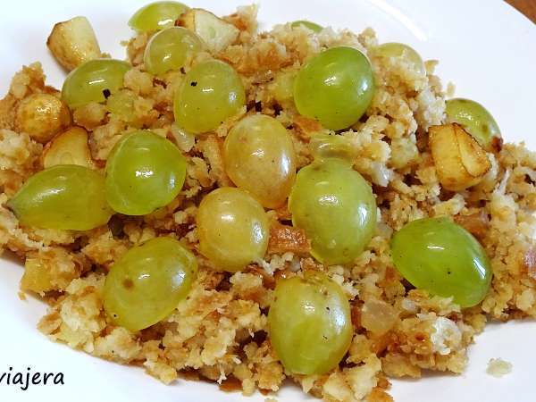 - Cuando estén algo doraditas se añade el tocino que habíamos refrito y se acompañan de granos de uva moscatel y los dientes de ajo dorados que habíamos reservado.