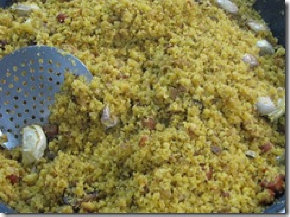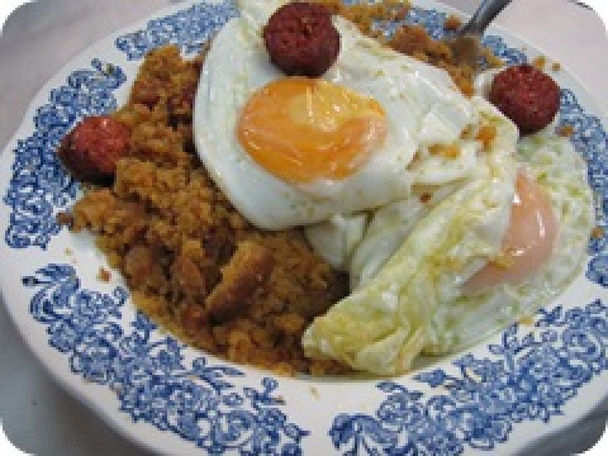 - Las migas estarán echas cuando queden sueltas y fritas. Lo servimos en un plato con un poco de jamón por encima y dos huevos fritos.