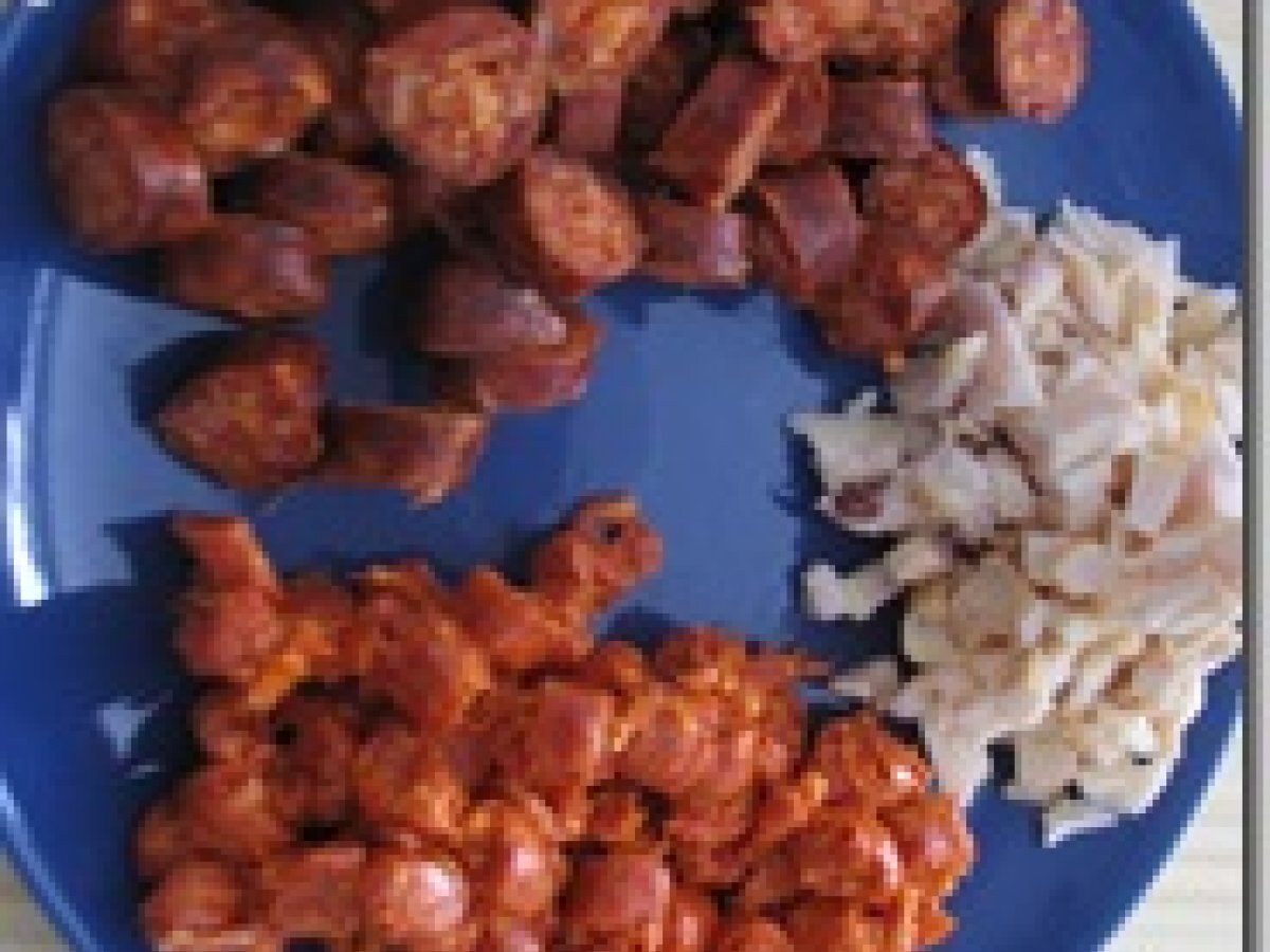 - Freímos los chorizos en rodajas y la chistorra sin piel y desmigada(se reserva).