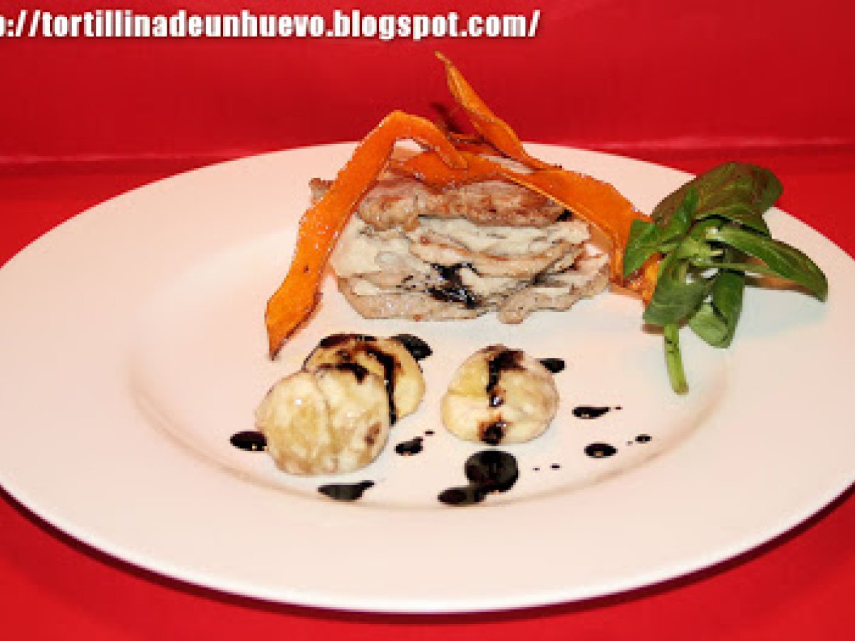 Milhojas de solomillo con pure de castañas, chips de calabaza y reducción de módena PlatoFácil35 min1222 Kcal Enviar esta receta a un amigo Imprimir esta página Preguntar al autor Publicar la foto de esta receta Ingredientes 2 2 solomillos de cerdo 1/2 kg de castañas 100 cc. de leche una bola de mantequilla (15-20 g) calabaza 150 ml. de Vinagre de Módena