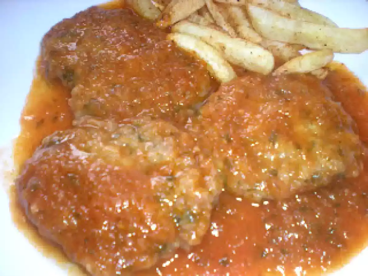 Mini filetes rusos en salsa de tomate AnteriorSiguiente PlatoFácil55 min758 Kcal Enviar esta receta a un amigo Imprimir esta página Preguntar al autor Publicar la foto de esta receta Ingredientes 4 400 g de carne picada de cerdo 200 g de carne picada de ternera 2 huevos 150 g de pan rayado 1 cuchara de perejil 1 toque de pimienta negra molida 1 toque de sal al gusto 1 chorreón de vino blanco Aceite de oliva para freír 300 g de tomate triturado de bote 1 pimiento verde picado 1 cebolla picada 3 dientes de ajos picados 1 cuchara de perejil 1 vaso de vino blanco 1 vaso de caldo de carne 1 toque de pimienta negra 1 punto de sal al gusto 5 cucharas de aceite de oliva Costo estimado: 11.86Euros€ (2.97€/porción)