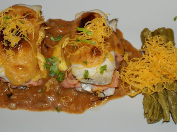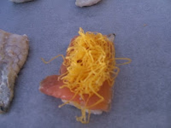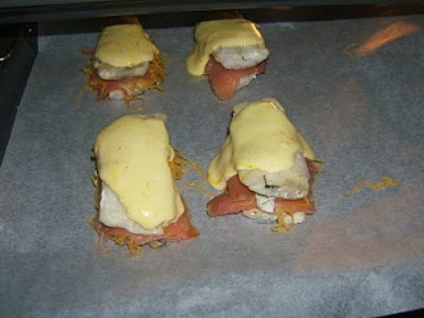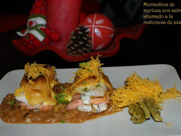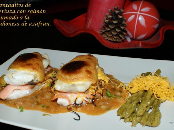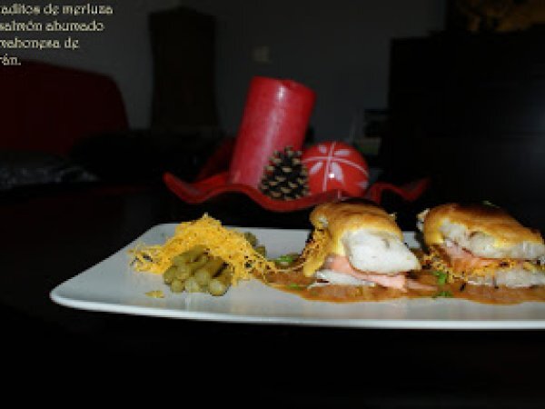Montaditos de merluza con salmón ahumado a la mahonesa de azafrán. AnteriorSiguiente PlatoFácil40 min400 Kcal Enviar esta receta a un amigo Imprimir esta página Preguntar al autor Publicar la foto de esta receta Ingredientes 4 8 filetitos de ventresca de merluza (en la receta original es lenguado, pero se puede utilizar pescado blanco al gusto) 1 sobre de salmón ahumado Huevo hilado Aceite de oliva. Para la salsa: 1 cebolleta 1 diente de ajo 1 cucharada de harina fina de maíz 1 cucharadita de pimentón de la Vera 1/2 vaso de vino blanco Aceite de oliva Perejil Caldo de pescado. Para la mahonesa de azafrán: 1 huevo Vinagre de Jerez Sal Azafrán Aceite de girasol