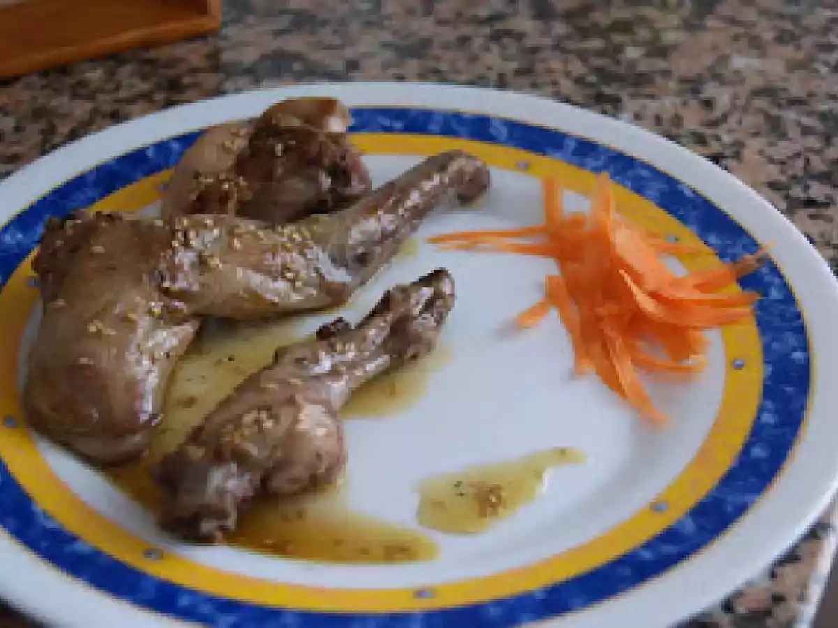 Muslitos de conejo con salsa de miel y tomillo PlatoFácil30 min2570 Kcal Enviar esta receta a un amigo Imprimir esta página Preguntar al autor Publicar la foto de esta receta Ingredientes 4 8 muslitos de conejo 3 cucharadas de tomillo 1 cucharada sopera de miel 2 cucharadas de sésamo (ajonjolí) 1/2 vaso de agua Sal Maldon Aceite