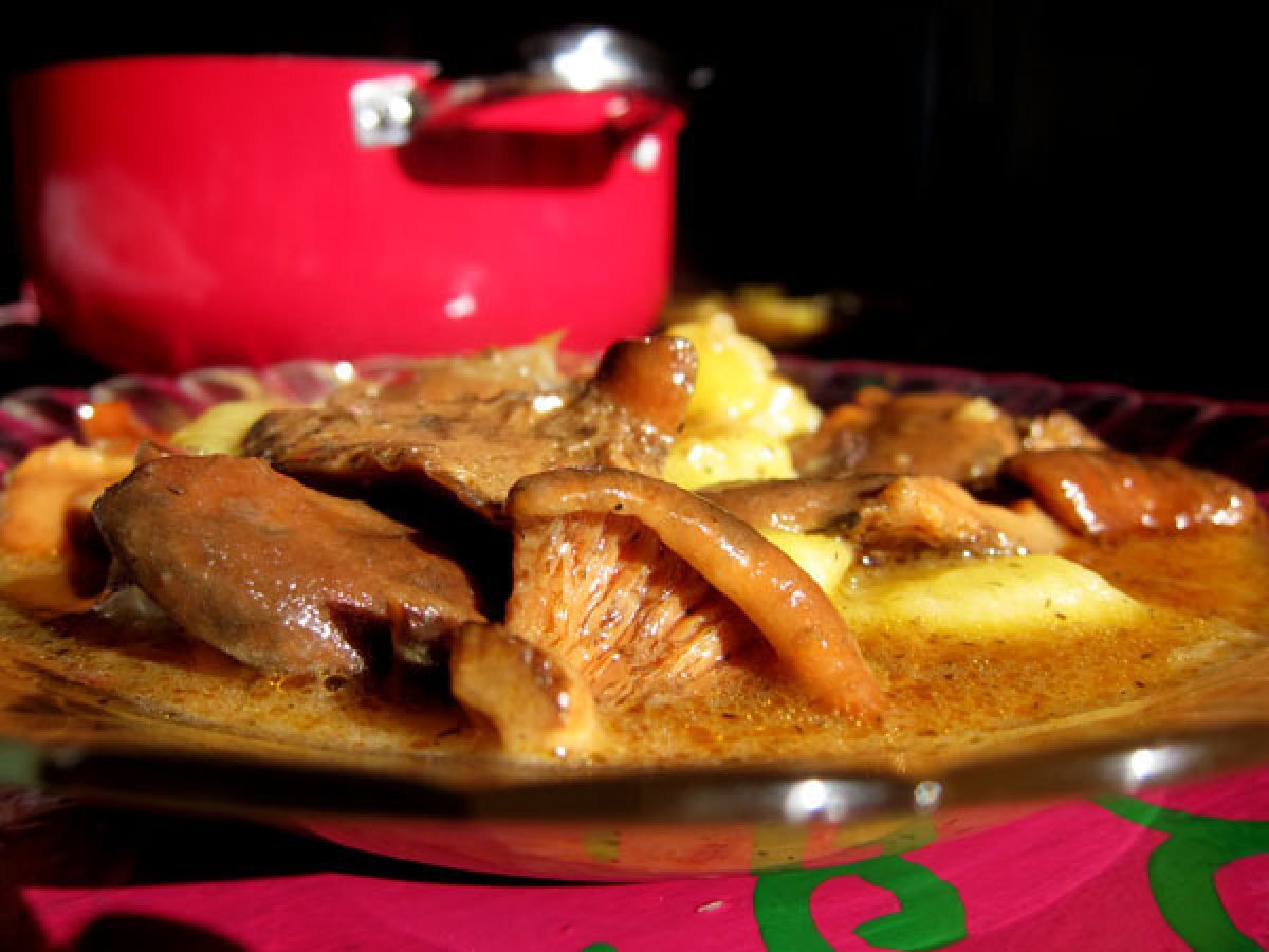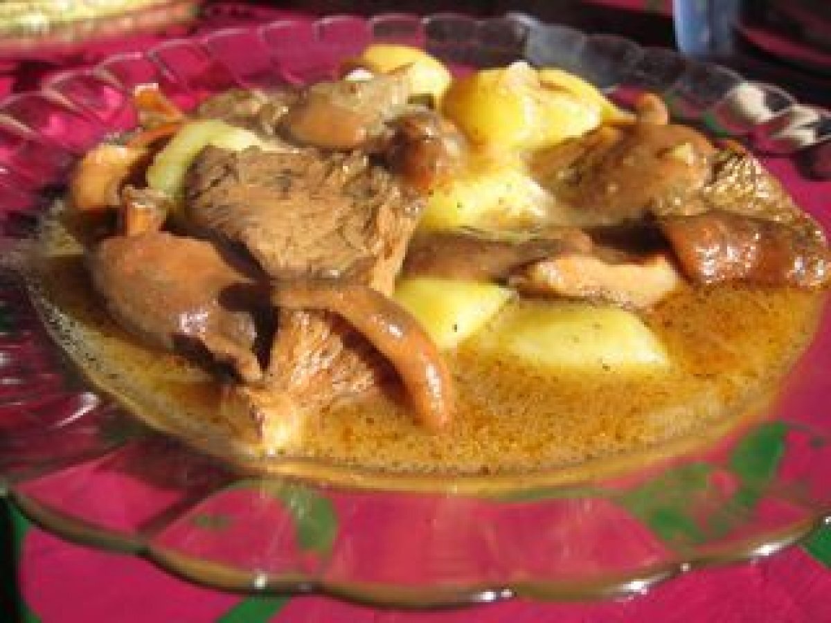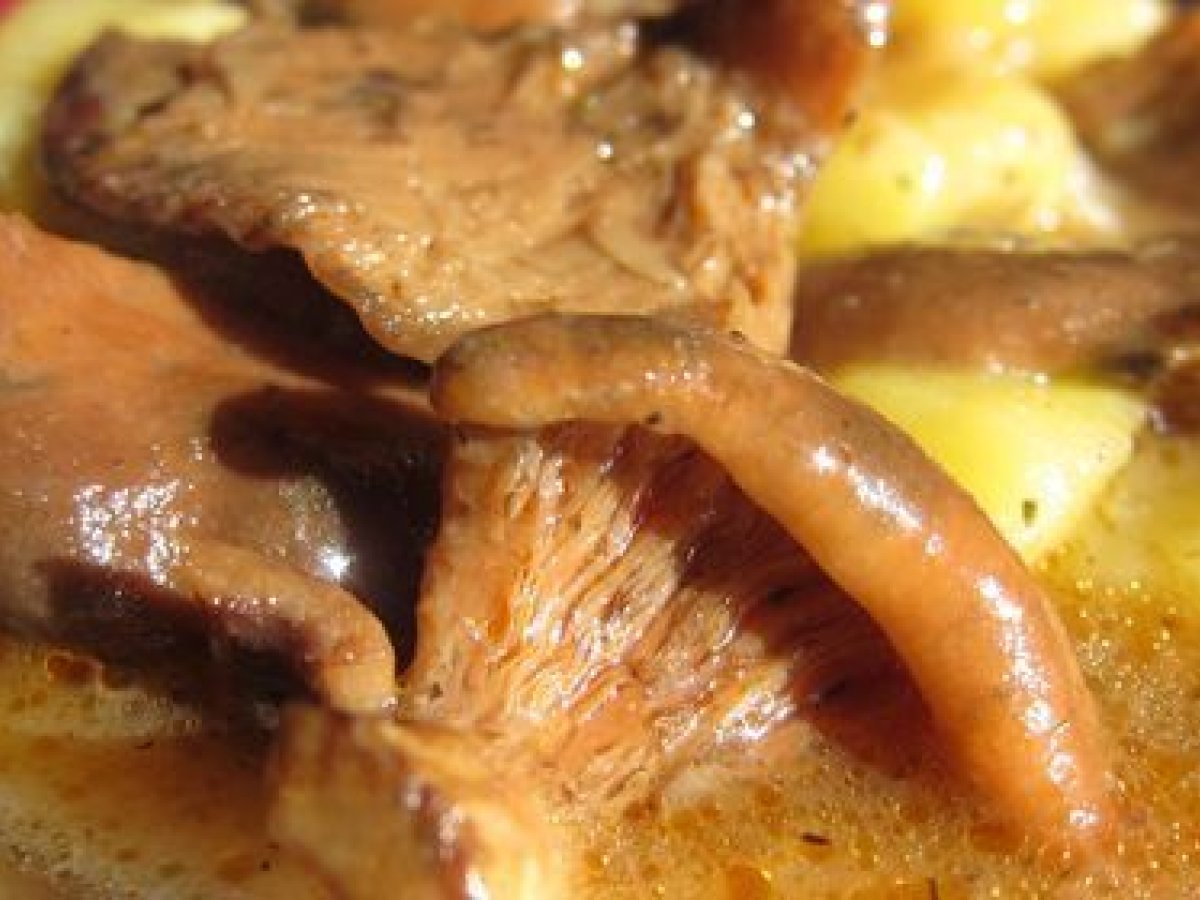 Níscalos con patatas a la cazuela. AnteriorSiguiente PlatoMedio40 min Enviar esta receta a un amigo Imprimir esta página Preguntar al autor Publicar la foto de esta receta Receta calentita, sabrosa y otoñal. Ideal para estos fríos. Ingredientes 1 (2 personas) 400gr de níscalos dos patatas pequeñas una cebolla pequeña una guindilla grande 4 dientes de ajo 1 cucharada colmada de harina. caldo de carne (de verduras para la versión vegetariana) tomillo, laurel, y pimentón dulce.