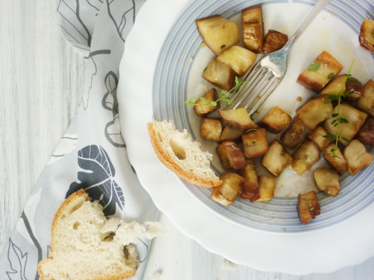 Noviembre, de nostalgias y {melanzane al funghetto} -berenjenas al horno con tomillo, AnteriorSiguiente PlatoFácil30 min223 Kcal Enviar esta receta a un amigo Imprimir esta página Preguntar al autor Publicar la foto de esta receta Ingredientes 3 750 g de berenjenas 40 g de aceite extravirgen de oliva 2 dientes de ajo sin alma (sin la parte del centro), cortados a la mitad 4 cucharadas de vinagre balsámico de Módena 1 puñado de tomillo fresco sal Costo estimado: 2.26Euros€ (0.75€/porción)