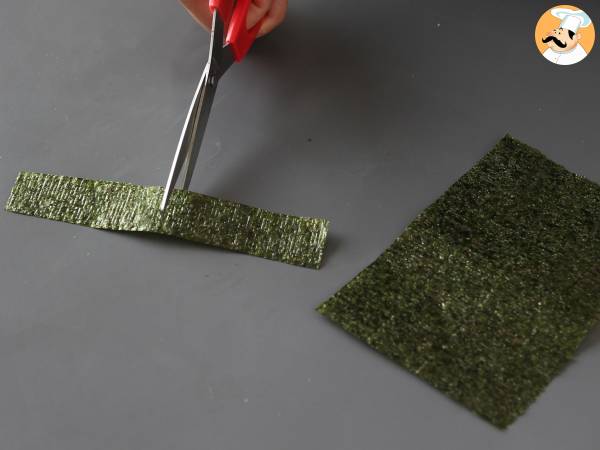 Corta las algas en tiras siguiendo las líneas de la hoja. Corta las tiras por la mitad. Necesitarás 6 en total.