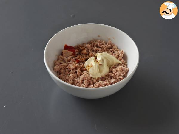 Escurre y desmenuza el atún. Añade la mayonesa, la salsa de soja y la salsa sriracha (opcional: omitir si no te gusta el picante). Mezcla bien.